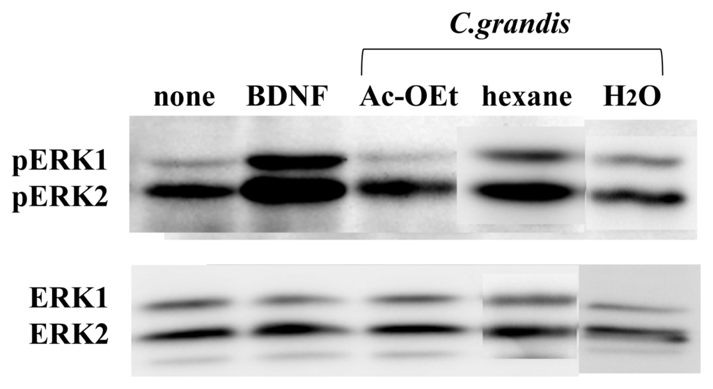 Effects of ethyl acetate (Ac-OEt), n-hexane and H2O (H2O) extracts of Citrus grandis (Kawachi bankan) on ERK1/2 activation in rat cortical neurons. Cells were treated with 100 μg/mL of each extract for 30 min or 50 ng/mL brain-derived neurotrophic factor (BDNF) for 10 min, and then equal amounts of protein were analyzed by immnoblot analysis.