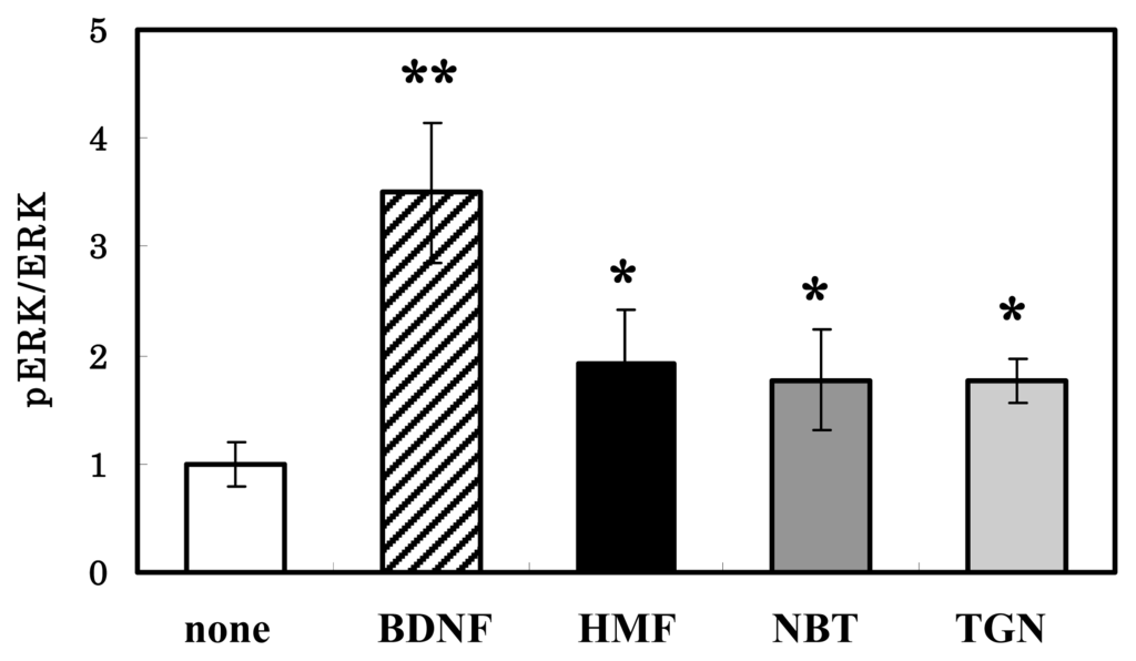 Effects of HMF, nobiletin (NBT) and tangeretin (TGN) on ERK2 activation in rat cortical neurons. Cells were treated with a 50 μM concentration of each compound for 30 min, and harvested for immunoblot analysis using antibodies against phosphorylated ERK1/2 and unphosphorylated ERK1/2. When cells were treated with 50 ng/mL BDNF, the incubation time was 10 min. The density ratio of pERK2 to total ERK2 in untreated cultures was expressed as 1 arbitrary unit. Results represent the mean ± SEM (n = 4, different cultures). Significant difference in values between the compound-treated and nontreated cells: * P < 0.05; ** P < 0.01 (Student’s t test).