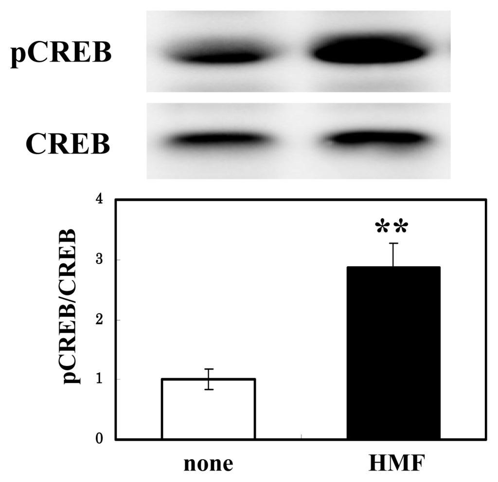 Effects of HMF on cAMP response element-binding protein (CREB) activation in rat cortical neurons. Cells were incubated with or without HMF at the concentration of 100 μM for 30 min, and the cell lysates were prepared and applied to immunoblot analysis. Values are presented as the mean ± SEM (n = 4). Significant difference in values between the HMF-treated and non-treated cells: ** P < 0.01 (Student’s t test).