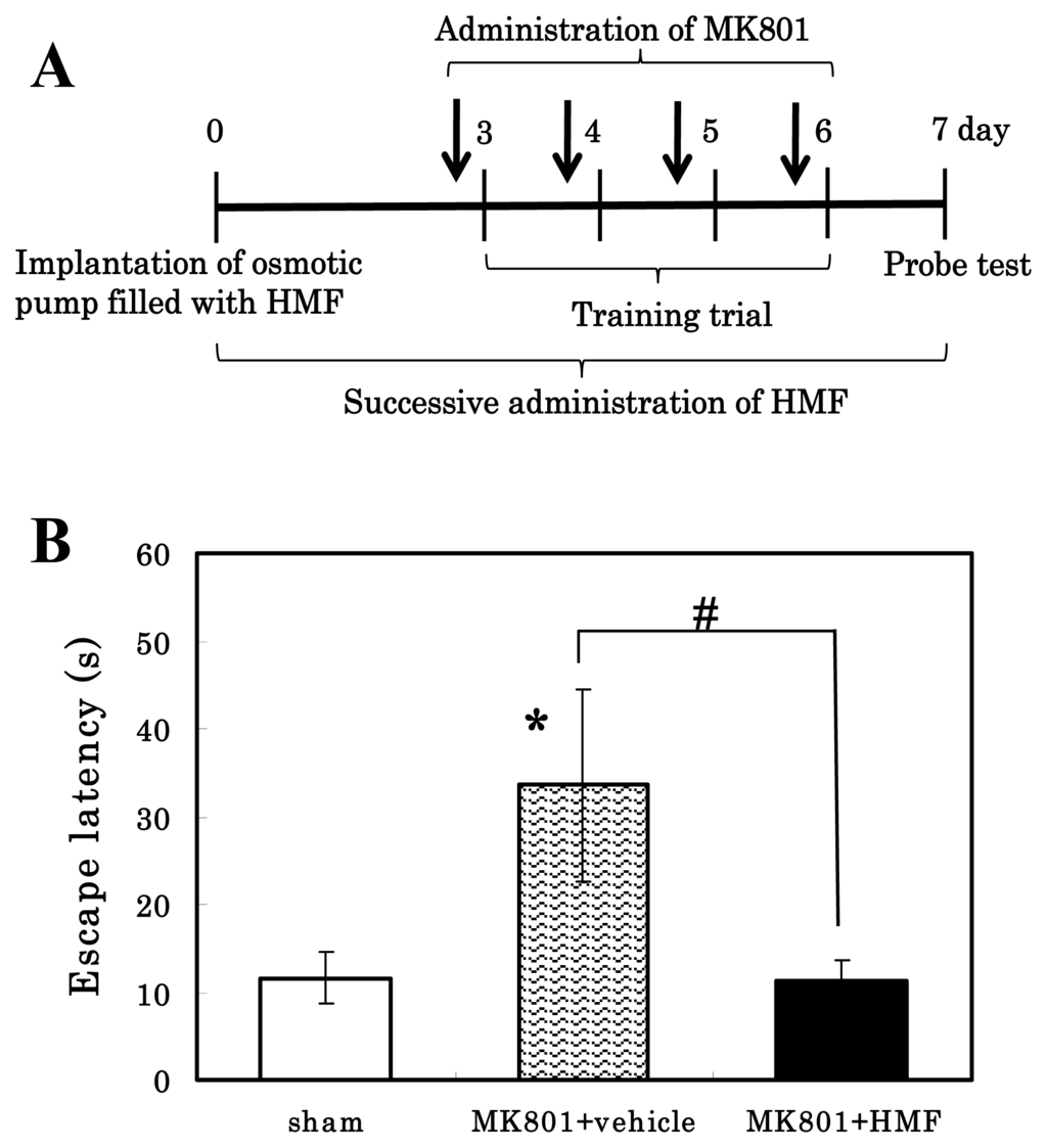 Effects of HMF on deterioration of spatial learning performance in MK-801-treated mice. (A) The time schedule of injection of HMF/MK-801 and the MWM test are shown; (B) Columns indicate the mean ± SEM (n = 5). Significant differences in values between the MK-801-treated and vehicle-treated (* P < 0.05; followed by Bonferroni’s Multiple Comparison Test), and HMF-treated (# P = 0.05).