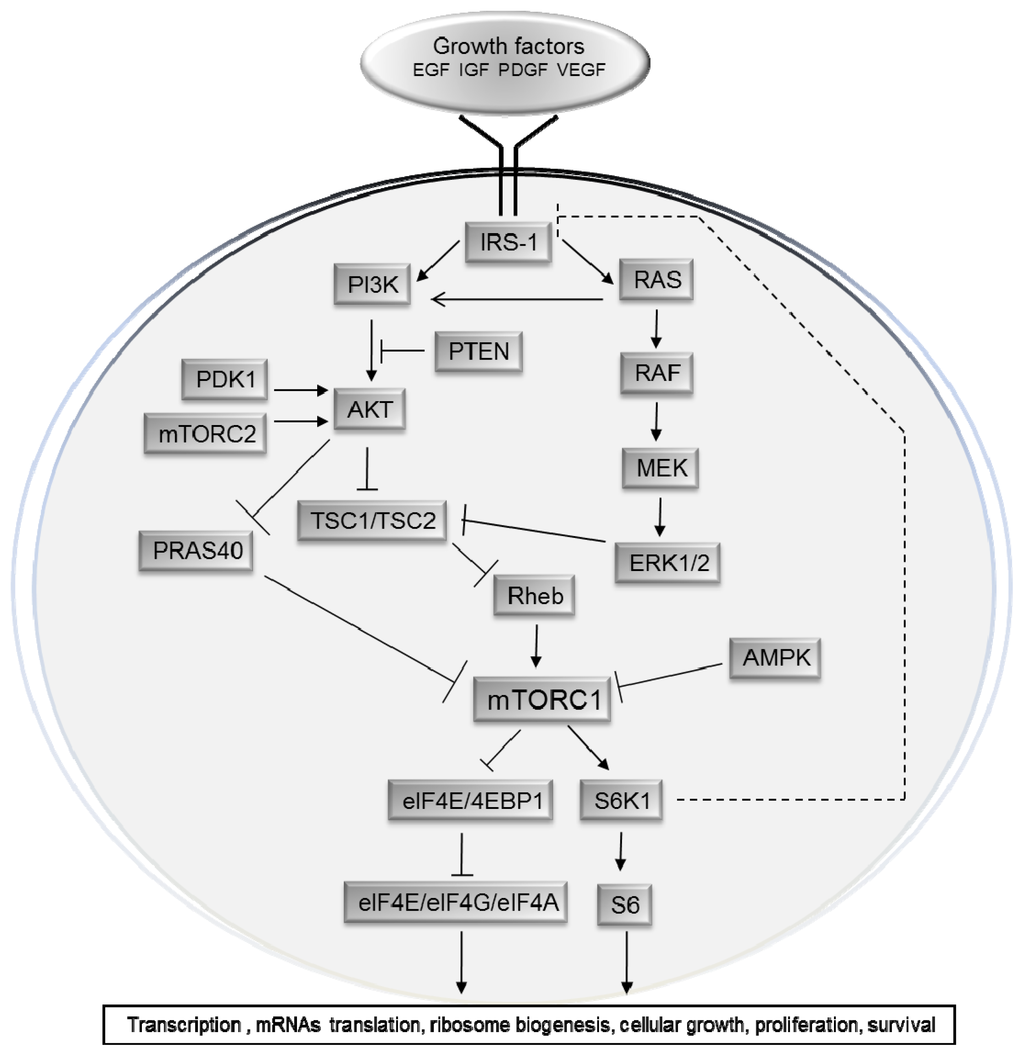 mTORC1 is activated by the PI3K/AKT pathway (Figure 3) and inhibited by the TSC1/TSC2 complex; it is a major regulator of ribosomal biogenesis and protein synthesis [21], through the phosphorylation and activation of S6K, and the phosphorylation and inactivation of the repressor of mRNA translation 4EBP1. Since they are the best characterized downstream targets of mTOR, the phosphorylation status of S6K and 4EBP1 are commonly used to evaluate mTORC1 activity in vivo. In addition, mTORC1 is also involved in the regulation of other proteins including CLIP-170 (cytoplasm linker protein-170) [22], eEF2 (eukaryotic elongation factor 2) kinase [23], ODC (ornithine decarboxylase) [24], glycogen synthase [25], HIF-1 α (hypoxia-inducible factor 1α) [26], lipin [27], PKCδ and PKCɛ [28], PP2A (protein phosphatase 2A) [29], p21Cip1 and p27Kip1 cyclin-dependent kinase inhibitors [30,31], Rb (retinoblastoma) protein [32], and STAT3 (signal transducer and activator of transcription 3) [33].