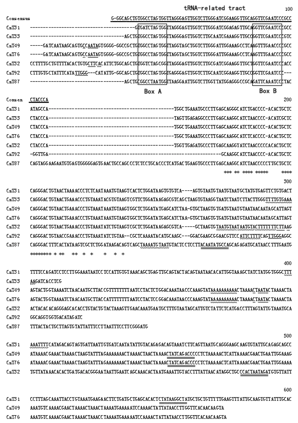 Cn-SINEs from Coilia nasus. The consensus sequences of the tRNA-related tract are shown on top and marked with thick bar. Boxes A and B are enclosed by solid lines. The target site duplications at each SINE locus are denoted by single underlines. A wavy line under nucleotides indicate poly(A) or AT-rich regions, and double lines under nucleotides show a reversed box A tract. Shaded nucleotides denote polymerase III transcription terminators. Asterisks indicate identical nucleotides; dashes denote gaps. GenBank accession numbers: JQ083280–JQ083286.