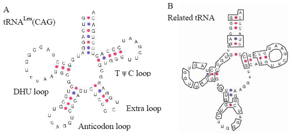 The secondary structure of tRNALeu(CAG) in Xenopus laevis taken from [20] (A) and the tRNALeu-related Cn-SINE family (B). The sequences identical to tRNALeu(CAG) in Cn-SINE are boxed.