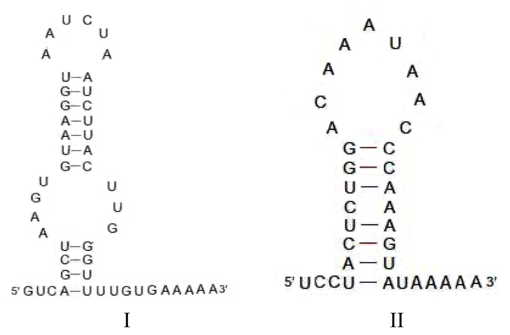 Analysis of the full-length SINEs isolated from C. nasus revealed direct repeats flanking each terminus of the SINEs in this family. A “TTT” sequence that acts as a strong polymerase III terminator in tRNA genes, including the tRNALeu gene [20], was found in the tail region, suggesting that transcription in SINE elements should terminate at this locus. The putative secondary structure of the tail region of Cn-SINE was as previously described [22]. Although two types (I and II) of loop structures were inferred from the sequences of the different clones, a hairpin structure was found in the tail with a string of A’s in the DNA template strand and the U’s in the RNA product (Figure 6). The rU-dA base pairs are exceptionally weak. This led polymerase III to pause at the rU-dA base pairs locus, allowed the RNA to dissociate from the DNA template strand and ensured the complete transcription of the SINEs. Interestingly, an imperfect inverse-repeated tract corresponding to box A was found in Cn-SINEs (Figure 4). It likely results from a head-to-head orientation of SINEs. This feature allowed us to isolate copies of these SINEs by use of a simple, single-primer PCR method.