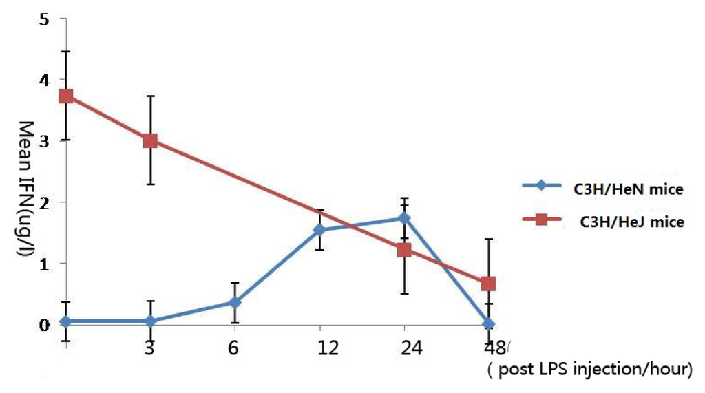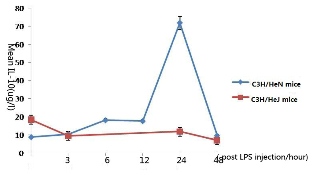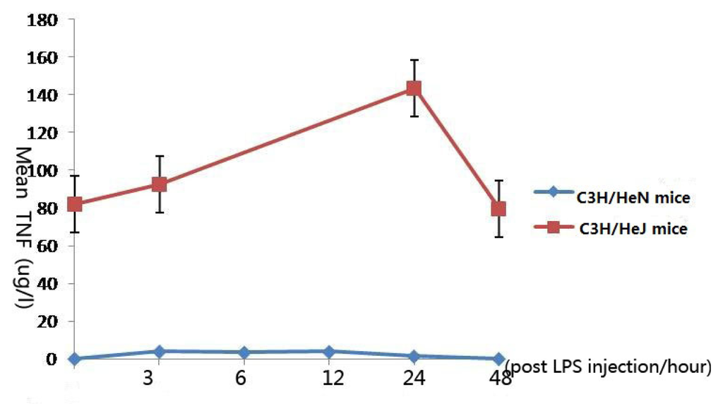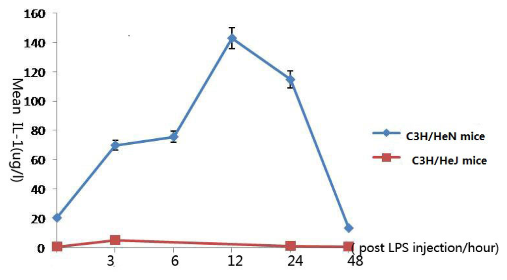 In C3H/HeJ mice, the concentration of TNF-α was so much higher than that in C3H/HeN mice, may be the concentration levels could affect its role in inflammation. In C3H/HeN mice, IL-1 reached its peak 12 h after LPS injection. Similar with TNF-α, the main secretory cell is macrophage. We presumed that TNF-α is the cytokine in the early stage of the inflammation, IL-1 is the cytokine in other stage of the inflammation. Furthermore, IL-1 and TNF-α reached the peak at the same time, maybe the secretion of them was influenced by each other. In C3H/HeJ mice, IL-1 reached the peak concentration 3 h after LPS injection, and the concentration was much lower than that in C3H/HeN mice. We supposed the concentration level was important for cytokine to play its role.
