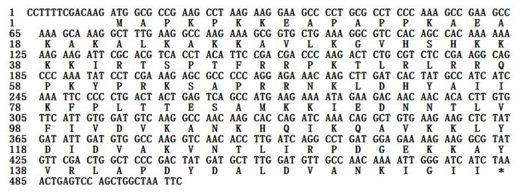 On the basis of the high identity, we concluded that the cDNA isolated is the cDNA encoding the Giant Panda RPL23A protein. The RPL23A sequence was submitted to Genbank (accession number: HQ318070). The 506 bp of the Giant Panda RPL23A sequence contains a 13 bp 5′-untranslated sequence and a 22 bp 3′-unstranslated region. An open-reading frame (ORF) of 471 bp encoding 156 amino acids was found in the cDNA sequence (Figure 2).
