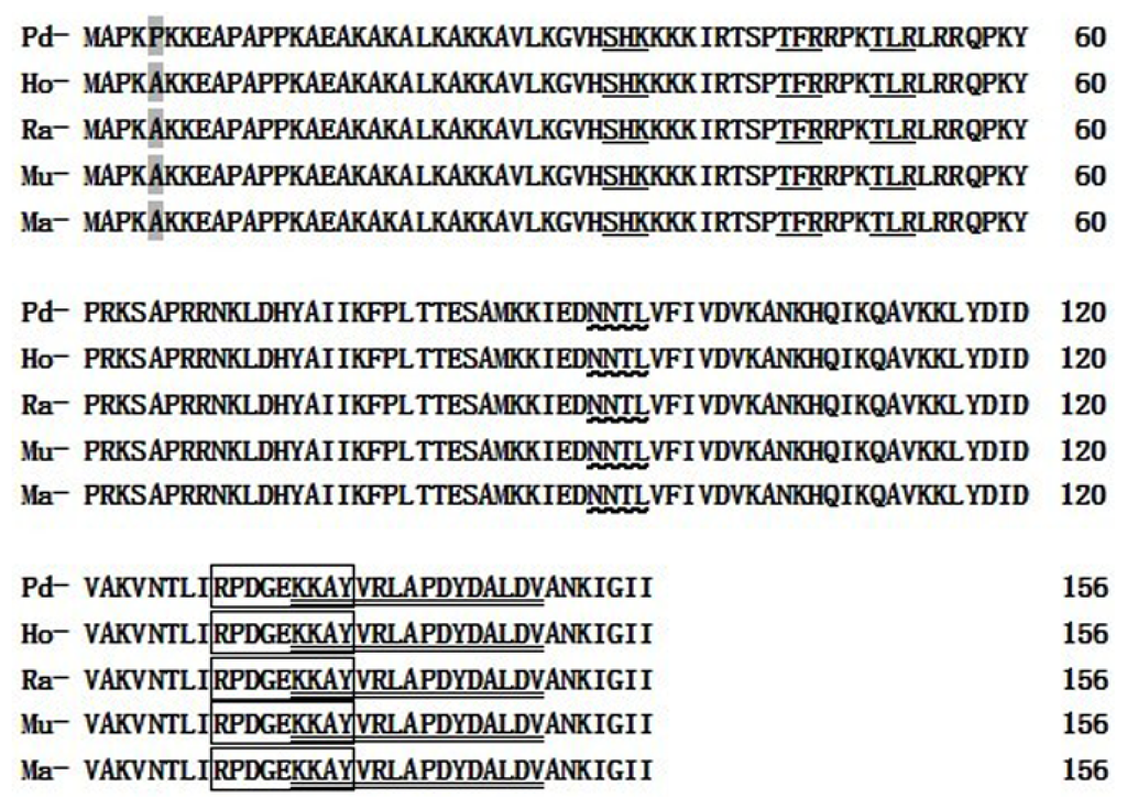 Primary structure analysis revealed that the molecular weight of the putative RPL23A protein of the Giant Panda is 17.7179 kDa with a theoretical pI 11.16 (Table 1). Like most ribosomal proteins, L23A is highly basic, containing a combined 45 Arg, Lys, and His residues and only 14 Asp and Glu residues, in which the highest content is the Lys residues (19.23%), far higher than other amino acids and without Cyc and Trp residues. Physical and chemical analysis showed that the molecular weight of the putative protein among the five mammalians is very close and the theoretical pI is identical (Table 1). The secondary structure analysis of RPL23A protein indicated that the protein was 15.38% in E (strand), 44.87% in H (helix) and 39.74% in C (coil). The secondary structure is slightly different compared with Homo sapiens, Macaca mulatta, Mus musculus and Rattus norvegicus (Table 2).