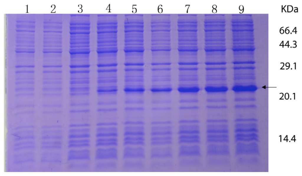 Protein extracted from recombinant E. coli strains were analyzed by SDS-PAGE gel stained with Commassie blue R 250. Numbers on right shows the molecular weight, and the arrow indicates the recombinant protein bands induced by IPTG with 0, 0.5, 1, 1.5, 2, 2.5, 3 and 3.5 h (lane 2–9), respectively. The lane 1 represents the products of the E. coli strains with the empty vectors.