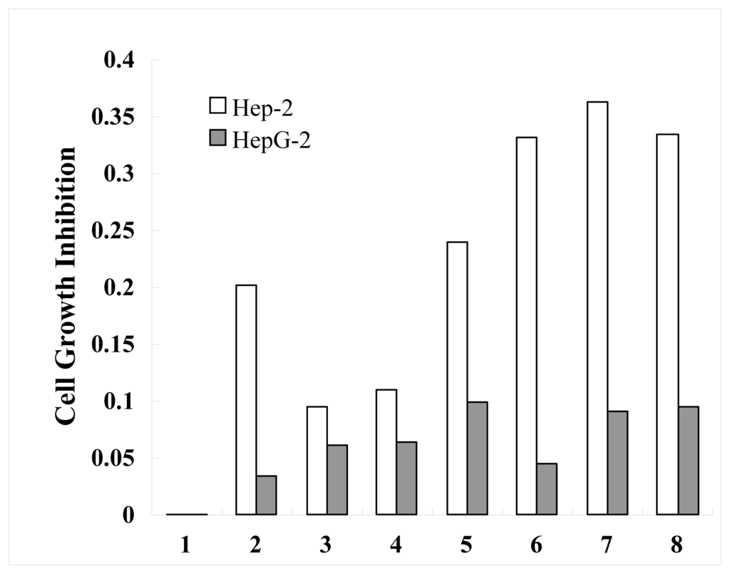 Laryngeal cancer may also be called cancer of the larynx or laryngeal carcinoma. Most laryngeal cancers are squamous cell carcinomas, reflecting their origin from the squamous cells which form the majority of the laryngeal epithelium. Laryngeal cancer may spread by direct extension to adjacent structures, by metastasis to regional cervical lymph nodes, or more distantly, through the blood stream. Distant metastates to the lung are most common [22]. A hardy cell line, HEp-2 resists temperature, nutritional, and environmental changes without a loss of viability. It has supported the growth of 10 of 14 arboviruses as well as the measles virus, and it has been used for experimental studies of tumor production in rats, hamsters, mice, embryonated eggs and volunteer terminal cancer patients [23,24]. HepG2 (Hepatocellular carcinoma, human) cells are epithelial in morphology, and secrete a variety of major plasma proteins; e.g., albumin, transferrin and the acute phase proteins fibrinogen, alpha 2-macroglobulin, alpha 1-antitrypsin, transferrin and plasminogen [25]. Our experiments gave different results because of the differences between these two kinds of cancer cells.
