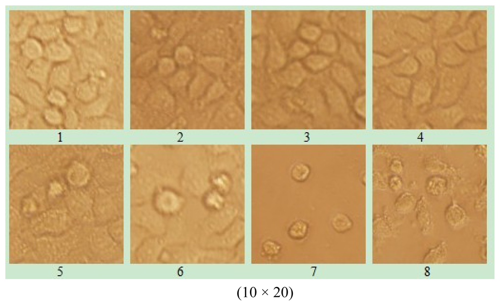 The effect of Ribosomal Protein L23A (RPL23A) from the Giant Panda on morphology of human laryngeal carcinoma Hep-2 cells for 0, 7.4, 2.96, 1.48, 0.74, 0.37, 0.185, 0.148 μg/mL (pictures 1–8), respectively.