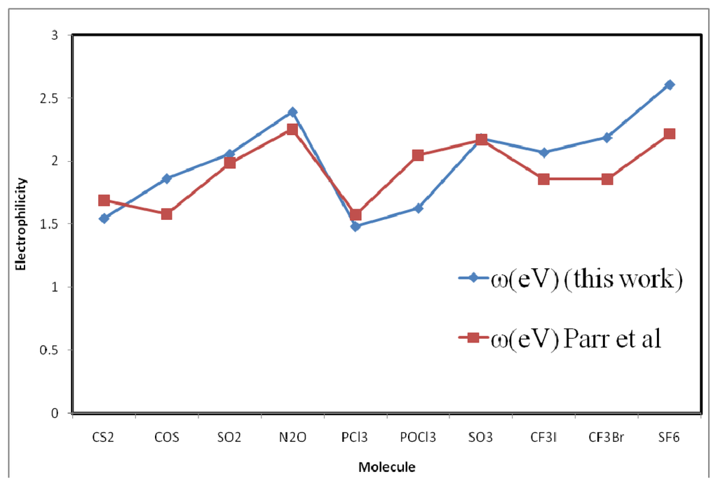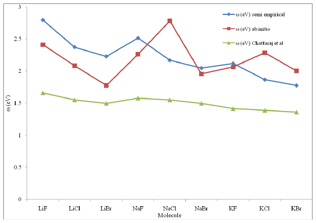 A close look at Table 1 for di-atomic molecules reveals that the ω values computed by the present work are systematically closer to the corresponding values of Parr et al. as compared with the corresponding values of Chattaraj et al. [8]. Figure 1 reveals that the profiles of electrophilicities of the present work and those of Parr et al. [10] are systematically closer and those of Chattaraj et al. [8] are far off the profile for the bench mark ω values.