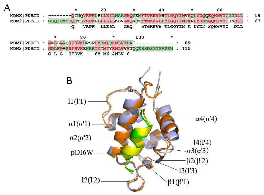 Sequence and structure of the binding domain of MDM2/MDMX to p53. (A) The sequence alignment of MDM2 with MDMX; (B) Stereoview of superimposed structures of pDI6W-MDM2 (green/orange) and pDI6W-MDMX (yellow/light blue) in a cartoon diagram. The sign “′” represents the second structure belonging to MDMX. In Figure 1B, α β and l represent α-helix, β-sheet and loop, respectively.