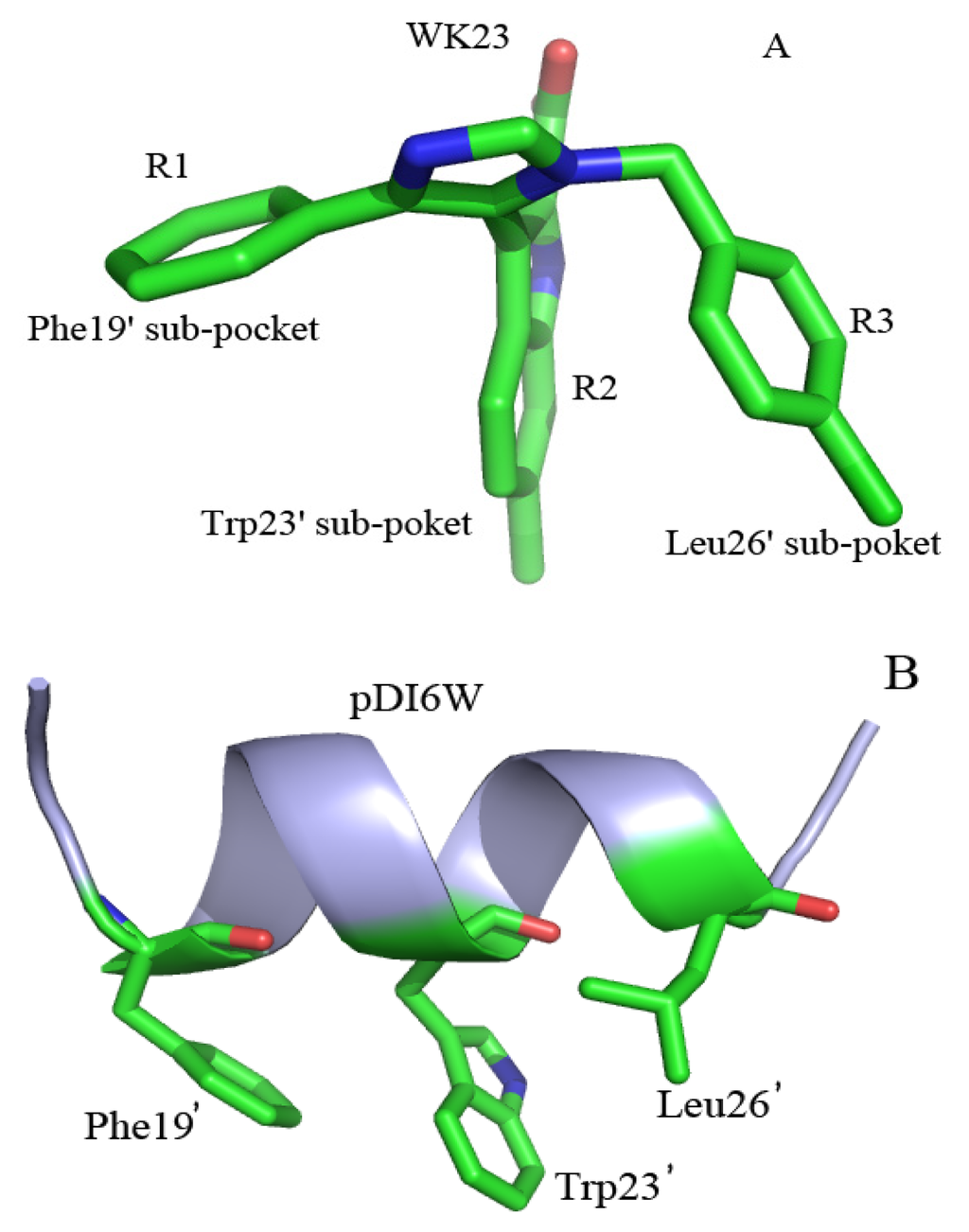Structures of inhibitors. (A) Non-peptide inhibitor WK23 is shown in sticks and green; (B) peptide inhibitor pDI6W is shown in cartoon and light blue, and three residues are shown in stick and green.