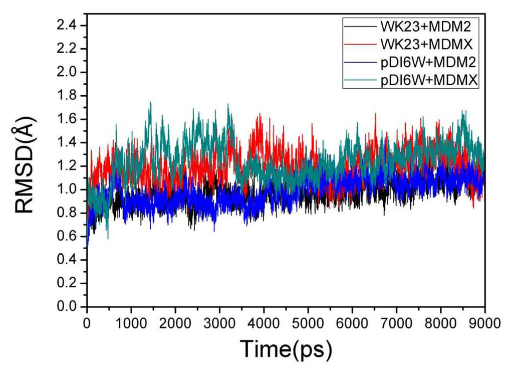 To evaluate the reliable stability of MD trajectories, RMSD of backbone atoms relative to the initial minimized structure through the phase of the simulation was plotted in Figure 3. One can see that four complexes have reached the equilibrium about after 4.5 ns of the simulation phase. According to Figure 3, the RMSD values of WK23-MDM2, pDI6W-MDM2, WK23-MDMX and pDI6W-MDMX complexes are 1.07, 1.08, 1.19 and 1.27 Å, respectively, with a deviation of lower than 0.65 Å. This result shows that the trajectories of MD simulations for four complexes after the equilibrium are reliable for post analyses. It was observed from Figure 3 that the RMSD values of two complexes involving MDM2 are lower than MDMX.