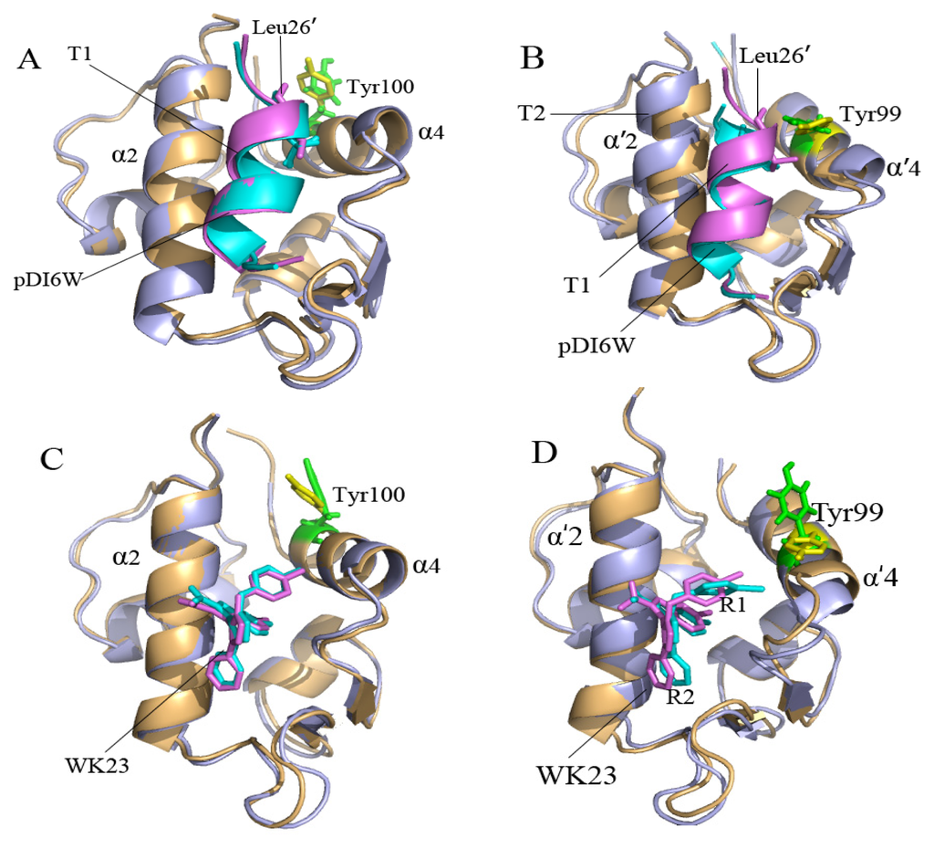 Crystal structures were superimposed on the average structure from the last 500 ps of molecular dynamics simulation at an interval of 10 ps, (A) for the pDI6W-MDM2 complex; (B) for the pDI6W-MDM2 one; (C) for the WK23-MDM2 one; and (D) for the WK23-MDMX one. In the average structure, protein, inhibitor and Tyr100 (Tyr99) are shown in light orange, cyan and green, respectively. In the crystal structure, the protein, inhibitor and Tyr100 (Tyr99) are displayed in light blue, violet and yellow. The residue Leu26′ is from pDI6W and second structure labeled by α′ belongs to MDMX. T1 represents the residues 49–51 in MDMX and T2 indicates the residues 24 and 25 in pDI6W.