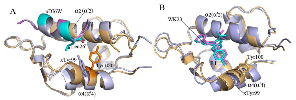 Stereoview of superimposed structures of inhibitor-MDM2 complex and inhibitor-MDMX complex. MDM2/MDMX and pDI6W are displayed in a cartoon mode, MDM2 is shown in light orange and MDMX in light blue, Leu26′, Tyr99 of MDMX and Tyr100 of MDM2 are shown in stick. (A) pDI6W-MDM2/MDMX complex; (B) WK23-MDM2/MDMX complex. The character “x” before the residue represents this residue belongs to MDMX.