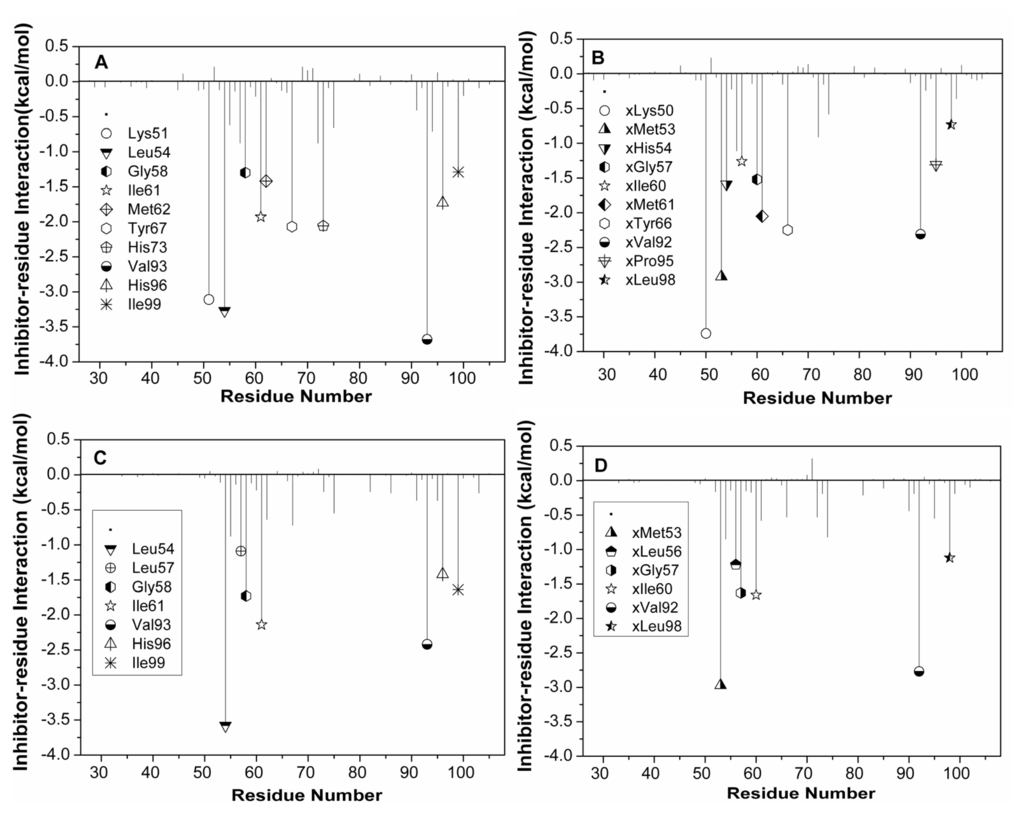 Inhibitor-residue interaction spectrum of (A) pDI6W-MDM2 complex; (B) pDI6W-MDMX complex; (C) WK23-MDM2 complex; and (D) WK23-MDMX complex based on MM-GBSA method. The residues with interaction energy of larger than 1 kcal·mol−1 are labeled. The character “x” before the residue represents this residue belongs to MDMX.
