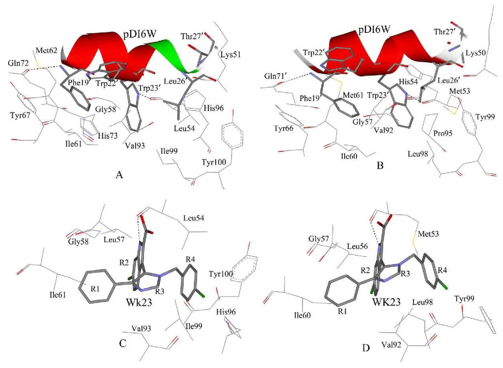 Geometries of key residues, which produce some favorable interactions with two inhibitors, are plotted in the complexes according to the lowest-energy structure from the MD trajectory. (A) pDI6W-MDM2 complex; (B) pDI6W-MDMX complex; (C) WK23-MDM2 complex; and (D) WK23-MDMX complex. The dashed line represents a hydrogen bond between the inhibitor and protein.