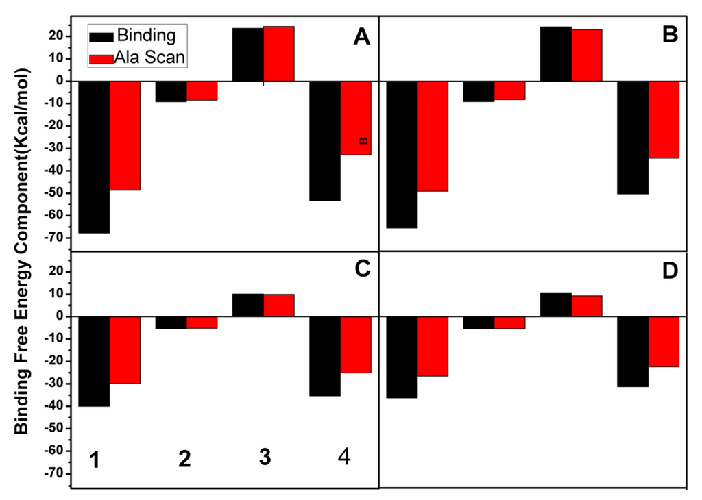 Changes of binding free energy components caused by alanine scanning. Binding of inhibitors to wild-type protein and mutated protein are represented by black and red, respectively. (A) pDI6W-MDM2 complex; (B) pDI6W-MDMX complex; (C) WK23-MDM2 complex; and (D) WK23-MDMX complex. Components are as follows: 1 van der Waals energy (ΔEvdw), 2 non-polar solvation energy (ΔGnopol), 3 polar interaction energy (ΔGpol + ele), 4 binding free energy (ΔGgb).
