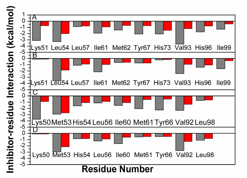 Changes of inhibitor-residue interaction energy caused by alanine scanning. Gray and red are used to represent the interactions of inhibitor with the residues of wild-type protein and mutated protein, respectively. (A) pDI6W-MDM2 complex; (B) WK23-MDM2 complex; (C) pDI6W-MDMX complex; and (D) WK23-MDMX complex.