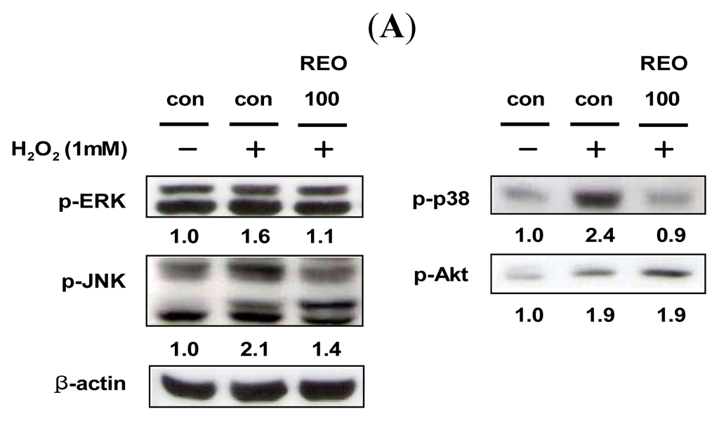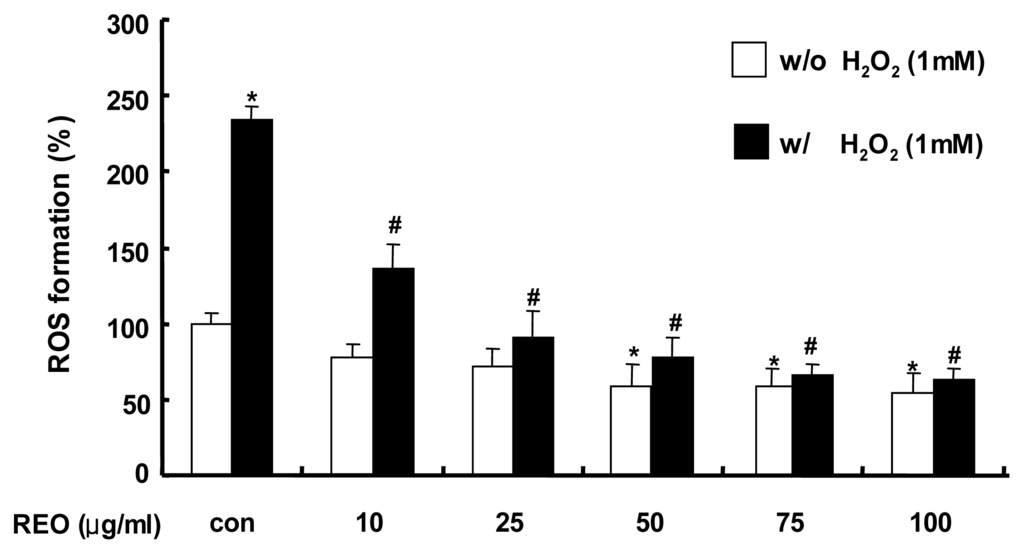 The oxidative damage caused by ROS may generate various diseases in humans such as aging, arthritis, cancer, inflammation, and heart diseases [23,24]. In the present study, 2′,7′-dichlorofluorescin diacetate (DCF-DA) staining was applied to examine whether REO was able to inhibit ROS production in H2O2-treated HepG2 cells. Hydrogen peroxide (H2O2) is produced endogenously from microsomes and peroxisomes and also by several physiological processes such as inflammatory respiratory burst and oxidative phosphorylation [6,25]. H2O2 has often been used as a model to investigate the mechanism of cell injury by oxidative stress [26,27]. When HepG2 cells were challenged with 1 mM H2O2, ROS were generated over 2-fold compared to the unchallenged control and the pretreatment with REO dose-dependently decreased the H2O2-mediated ROS formation (Figure 1). This dose-dependent antioxidant activity of REO was also observed even in the absence of H2O2. These results imply that REO may have an ability to directly scavenge ROS and/or free radicals.