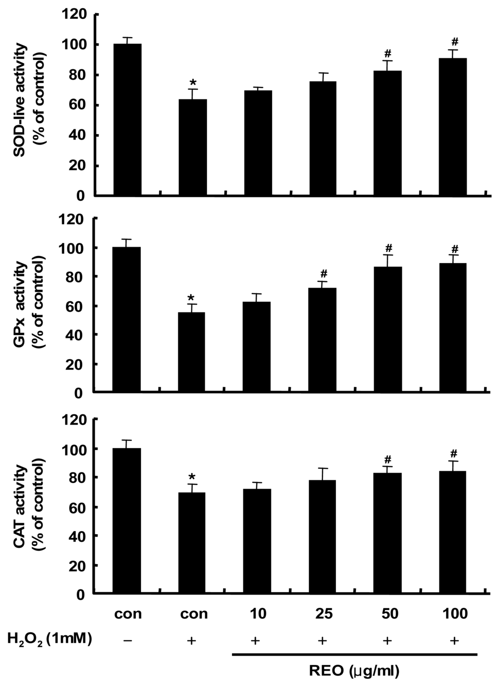 Effects of REO on superoxide dismutase (SOD)-like, glutathione peroxidase (GPx) and catalase (CAT) activities in H2O2-treated HepG2 cells. Data are mean ± SD values of three individual experiments. The values were compared with the control using analysis of variance followed by unpaired student’s t tests. * p < 0.05, significant differences from the unstimulated control group. # p < 0.05, significant differences from the H2O2-treated group.