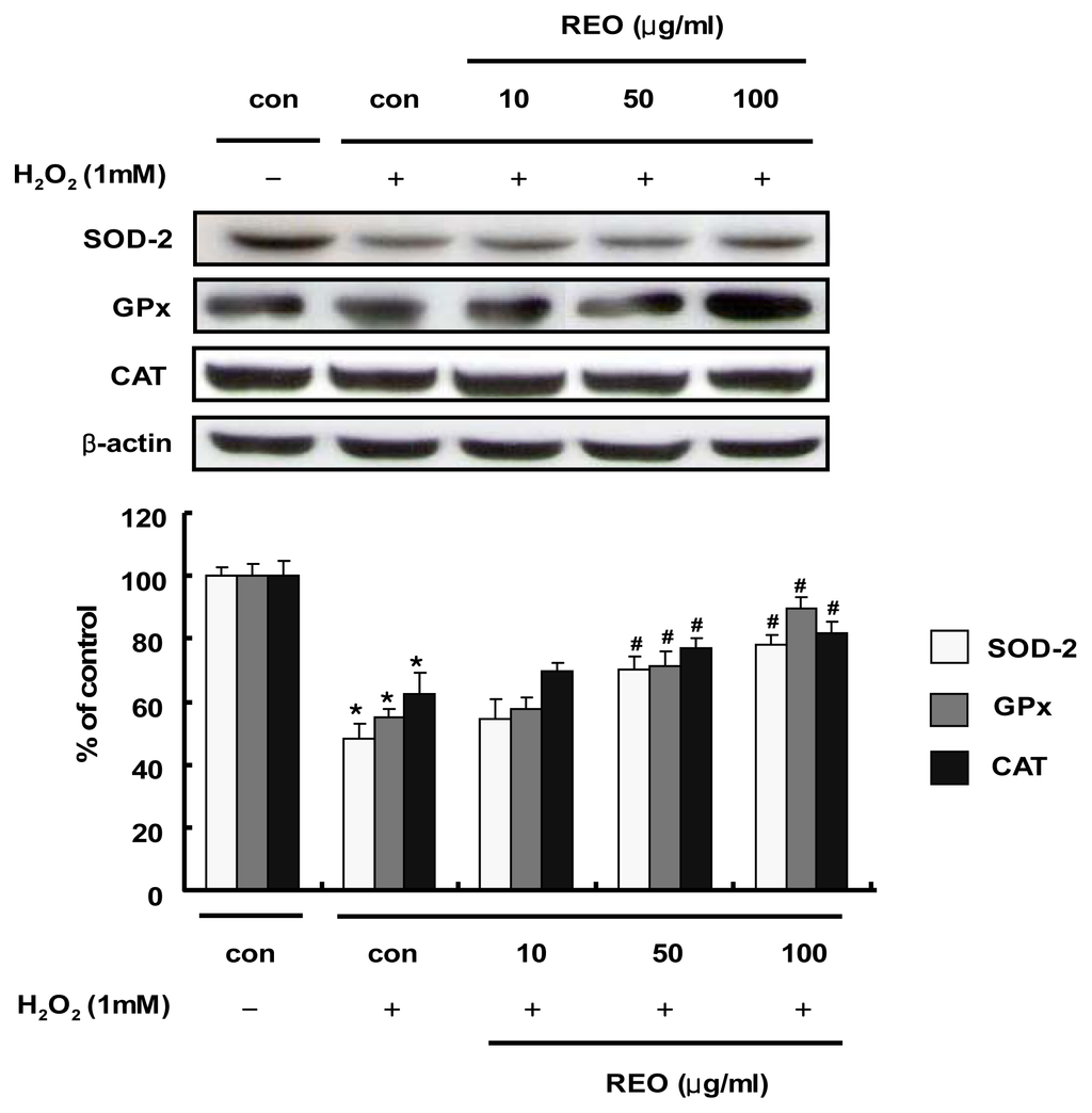 Effects of REO on SOD, GPx and CAT protein expressions in HepG2 cells. The bands shown are representative of three independent experiments with similar results. Values are means ± SD; n = 3. * p < 0.05, significantly different from the unstimulated control group. # p < 0.05, significantly different from the H2O2-treated group.