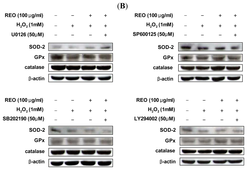 The MAPK family plays important roles in regulation of cell proliferation and cell death in response to various cellular stresses [32]. To determine whether REO can modulate the upstream signaling pathways, HepG2 cells were treated with REO and the phosphorylations of ERK, JNK, p38 and Akt were analyzed. The results indicated that H2O2 stimulated phosphorylations of all MAPKs and Akt (Figures 4A). The induced expression of phosphorylated ERK, JNK and p38 by H2O2 was down-regulated by REO, whereas phosphorylation of Akt was up-regulated (Figure 4A). To further elucidate the modulatory effects of REO on MAPK and Akt signaling pathways and their involvement in antioxidant enzyme expression, cells were treated with specific inhibitors of each MAPKs and Akt (U0126, an inhibitor of MEK1/2; SP600125, an inhibitor of JNK; SB202190, an inhibitor of p38; and LY294002, an inhibitor of phosphoinositide 3-kinase (PI3K)/Akt). The stimulated expression of SOD by REO was down-regulated by treatment with the p38-specific inhibitor, and those of GPx and CAT by REO were decreased by treatments with JNK specific inhibitor (Figure 4B). Accordingly, REO seems to induce the expression of SOD through inhibition of p38 phosphorylation, while it induces the expression of GPx and CAT via blockade of JNK phosphorylation. Zhang and Wang [33] have reported that a notoginseng saponin notoginsenoside R1 inhibits TNF-alpha-induced ERK activation in human arterial smooth muscle cells by suppressing NADPH oxidase-mediated ROS generation and directly scavenging ROS. Notoginseng n-butanol extracts have been shown to inhibit the LPS-stimulated activation of JNK and ERK signaling in RAW264.7 cells [34]. So far, there have been few reports on the effect of ginseng ingredients on the relationship between antioxidant enzymes and MAPKs pathways. Our previous study demonstrated that a flavonoid quercitrin from Cedrela sinensis down-regulates H2O2-induced phosphorylations of Akt and three MAPKs (ERK, JNK, and p38) in HepG2 cells [7]. In the study, we found that quercitrin-induced expression of GPx was ameliorated by the p38-specific inhibitor and the Akt/PI3K inhibitor, whereas the expression of SOD by quercitrin was diminished only by the p38 inhibitor. Upstream molecules such as MAPKs and Akt are certainly involved in modulation of the expression and activity of the antioxidant enzymes. However, the mode of regulation seems to be different by cell types as well as by compounds treated.