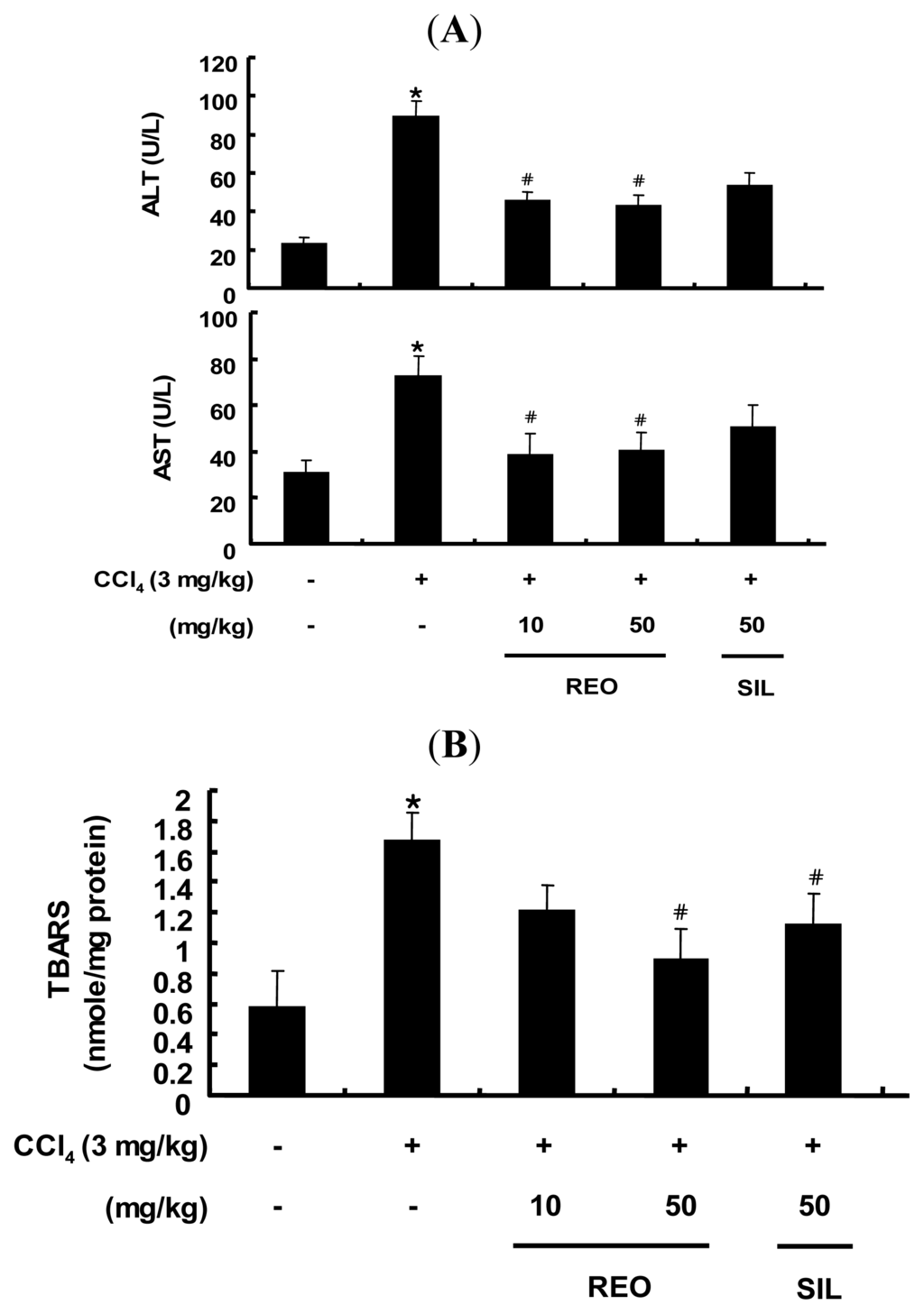 Effects of REO administration on the activities of (A) serum alanine transaminase, serum aspartate transaminase and (B) hepatic thiobarbituric acid reactive Substance (TBARS) content in CCl4-treated mice. Each value represents the mean ± SD for 8 mice. * p < 0.05, significantly different from the unstimulated control group. # p < 0.05, significant differences from the CCl4-treated group.