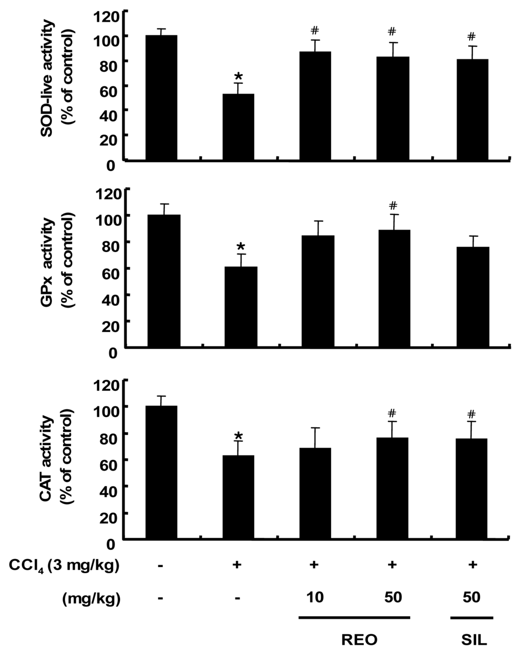 Effects of REO on hepatic SOD, GPx and CAT activities in CCl4-treated mice. Each value represents the mean ± SD for 8 mice. * p < 0.05, significantly different from the unstimulated control group. # p < 0.05, significant differences from the CCl4-treated group.