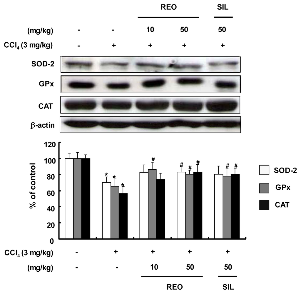 Effects of REO on SOD, GPx and CAT protein expression in CCl4-treated mice. Each value represents the mean ± SD for 8 mice. * p < 0.05, significant differences from the unstimulated control group. # p < 0.05, significant differences from the CCl4-treated group.