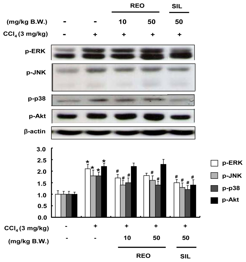 Effects of REO on MAP kinase and Akt protein expressions in liver of CCl4-treated mice. Each value represents the mean ± SD for 8 mice. * p < 0.05, significant differences from the unstimulated control group. # p < 0.05, significant differences from the CCl4-treated group.