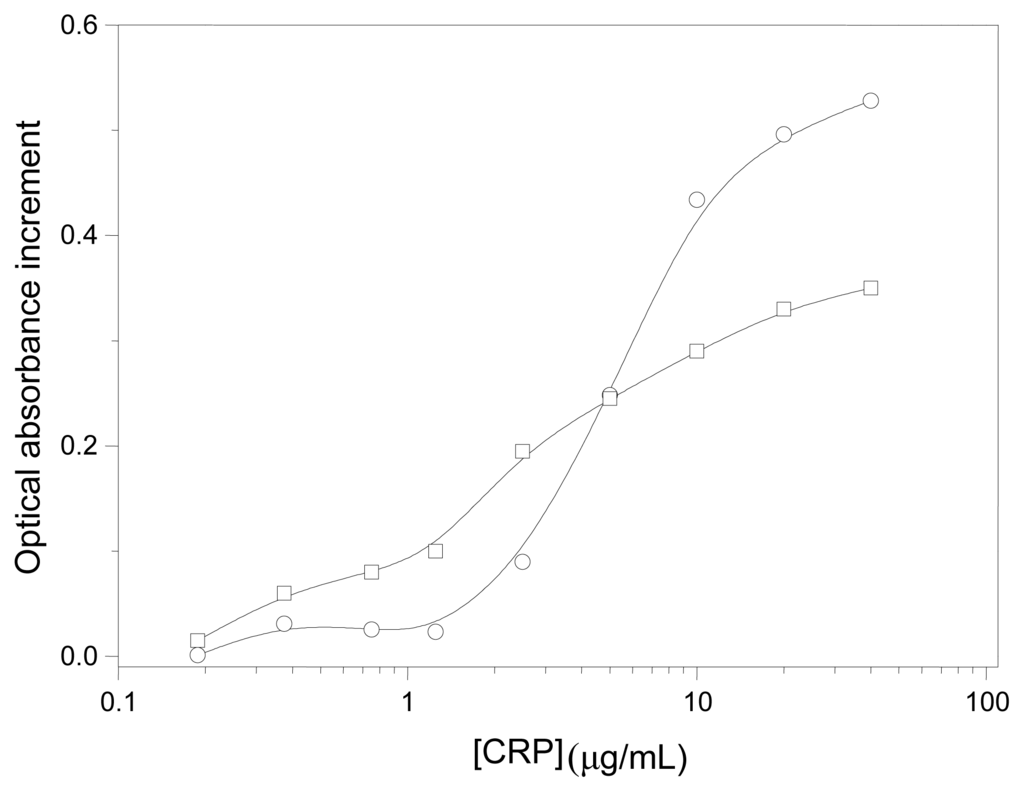 Absorbance change after 300 s (λ = 570 nm) due to aggregation induced by different C-reactive protein (CRP) concentrations: (○) PhS-1 mgIgG/m2; (□) PhS-2.5 mgIgG/m2. Reaction medium: 13 mM borate (pH 8.0), 150 mM NaCl, 1 mg/mL NaN3, 1 mg/mL BSA. The starting point of optical absorbance for all experiments was 0.5.
