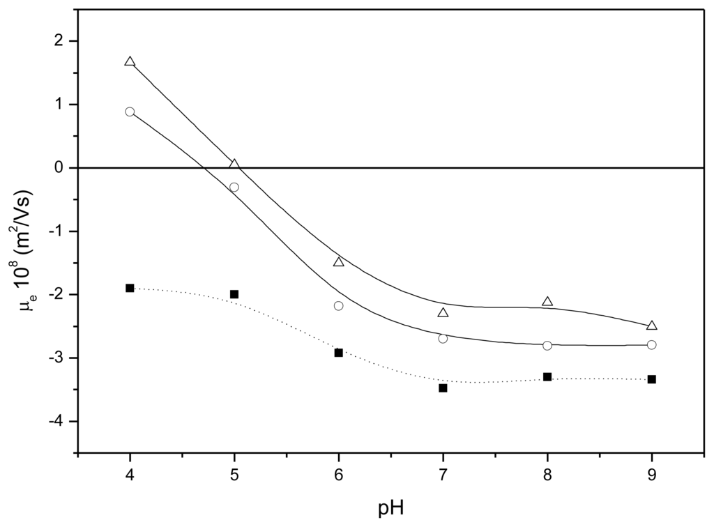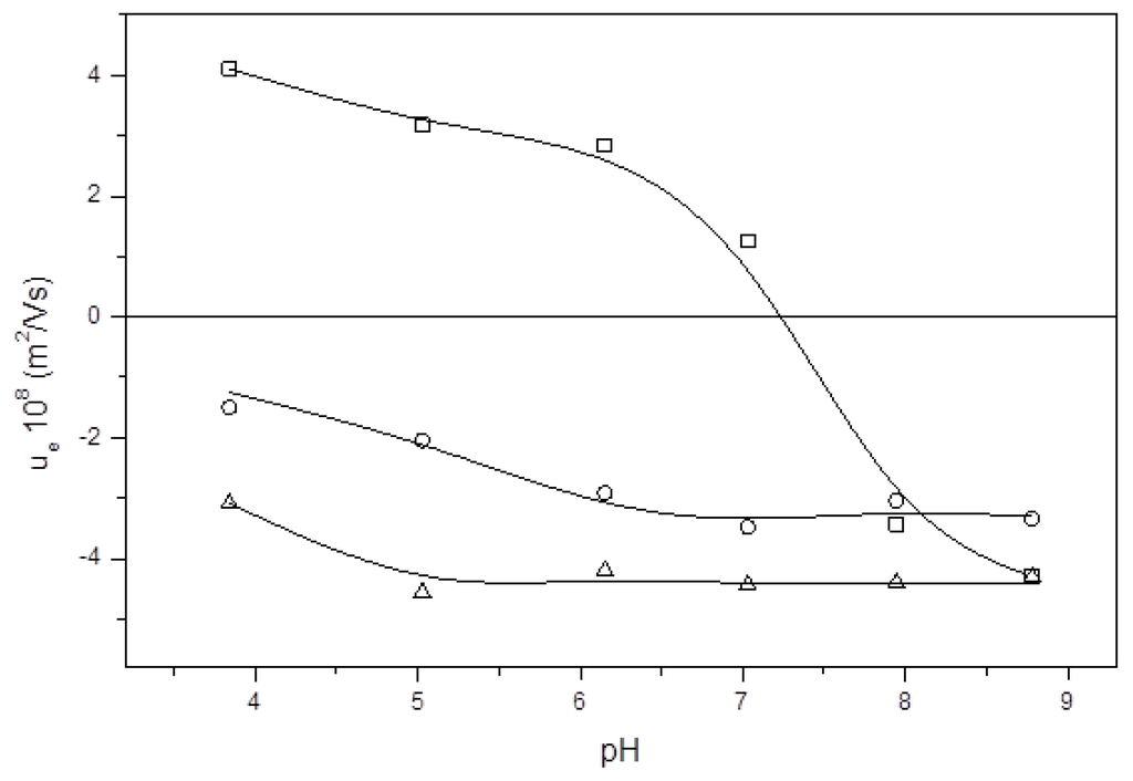 A Zetasizer-nano (Malvern Instruments, UK) was used to measure the electrophoretic mobility (μe). The study was focused on measuring the μe as a function of pH while maintaining a constant low-ionic-strength value (0.002 M). Each μe mobility datum was the average of 6 individual measurements.