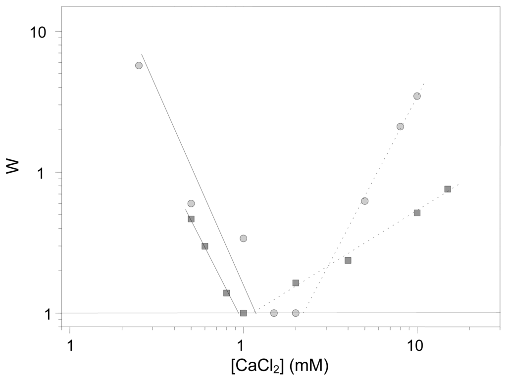 Stability factor vs. calcium chloride concentration (mM) at pH 7.4: (■) 1 mg/m2 IgG-PhS; (●) 2.5 mg/m2 IgG-PhS. Solid lines help to locate the CCC values, while dashed lines point to the CSC data.