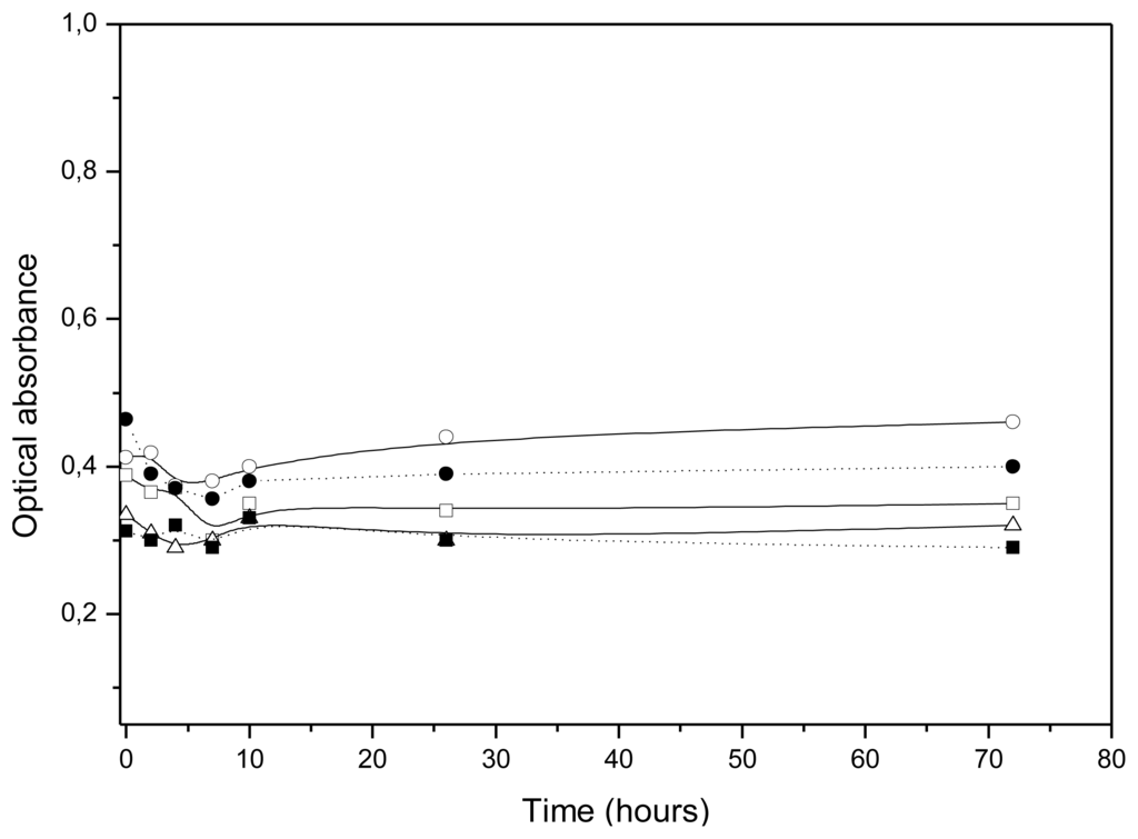 Once the stability was evaluated in simple pH 7.4 media, it was analyzed in the cell-culture medium (DMEM) supplemented with FBS, used to develop the in vitro uptake experiments in order to ensure that our different nanosystems preserve their colloidal stability in this complex medium. Figure 6 shows the time evolution of optical absorbance when nanocapsules were introduced in the cell-culture medium. The absorbance remained constant, indicating that no aggregation took place. Taking into account the CSC values shown in Table 2, the high stability of all our LNC systems in this culture medium must be governed by the intrinsic hydrophilic character of their respective surfaces, since DMEM is a medium enriched with different cations that strengthen hydration forces enough to keep all of our nanoparticles stable.