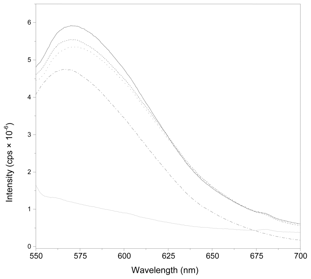 Emission spectrum of Red Nile in olive oil and water, and inside different nanoparticles. (black line) EPI; (dashed line) CS; (dotted line) PhS; (dash-dot line) Olive oil; (gray line) water.