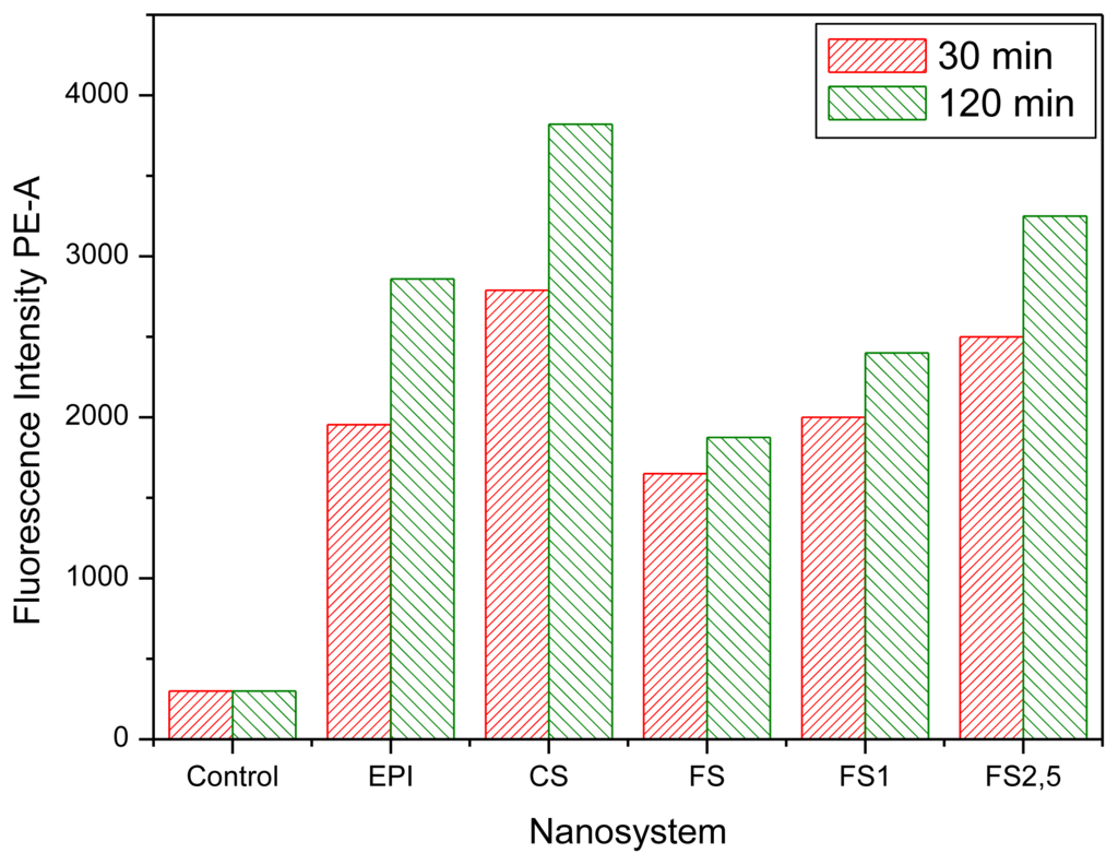 The cell uptake of these fluorescent nanocapsules was analyzed by flow cytometric assays. Figure 8 shows the fluorescence intensity of the cell cultures containing different nanosystems after 30 min and 2 h of incubation time. The results led us to perform a quantitative analysis of the different nanocapsules, showing that the internalization efficacy was significantly changed by the nature and properties of the different shells. A combination of surface charge and hydrophilicity plays the major role in affinity in the endocytosis pathway [47]. Results with CS nanocapsules showed the highest fluorescent intensity, in agreement with the enhanced mucoadhesion properties reported for chitosan nanosystems [9,48]. The lower fluorescent response observed with the EPI and PhS systems appeared to be related both to the negative surface charge of these nanocapsules as well as to the hydrophilic character provided by poloxamer molecules—which produce more biocompatible systems but at the same time reducing their cellular uptake [10,49]. The higher hydrophilicity of the PhS surface (which presents an enriched Pluronic® F68 layer according to the mobility and stability data) could be responsible for the low fluorescent intensity shown by these nanocapsules in comparison with the EPI ones.