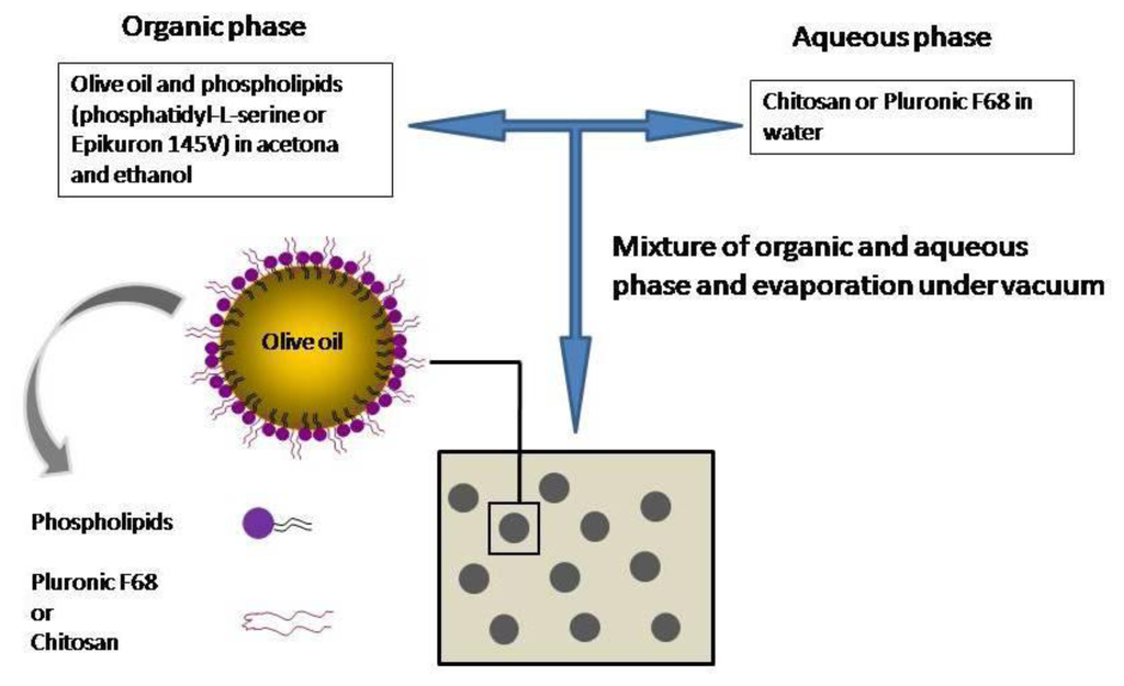 The nanosystems studied were prepared by a solvent-displacement technique following the procedure of Prego et al. [50]. This is a well-known technique widely reported for the preparation of nanocapsules, where hydrophilic surfactants are usually dissolved in the aqueous phase before emulsion formation. Briefly, an organic phase was prepared containing 125 μL of olive oil and phospholipids: 40 mg of Epikuron 145 V (EPI nanocapsules) or 10 mg of phosphatidyl-L-serine (PhS nanocapsules) dissolved in 0.5 mL ethanol and 9.5 mL of acetone. This organic phase was immediately poured over an aqueous phase containing 50 mg of Pluronic® F68 or 10 mg of chitosan oligomers. The mixture turned milky immediately because of the formation of the nanoemulsion. Then, the organic solvents were evaporated under vacuum to a final volume of 15 mL. Figure 9 shows a scheme of the synthesis procedure. All nanosystems presented olive oil in their hydrophobic core and, depending on the composition of the organic and aqueous phases, the final sample showed different interface properties. Thus, three different systems were formulated: EPI nanocapsules with a surface shell composed by epikuron and Pluronic® F68; CS nanocapsules with epikuron and chitosan oligomers; and finally, PhS nanocapsules with phosphatidyl-L-serine and Pluronic® F68.
