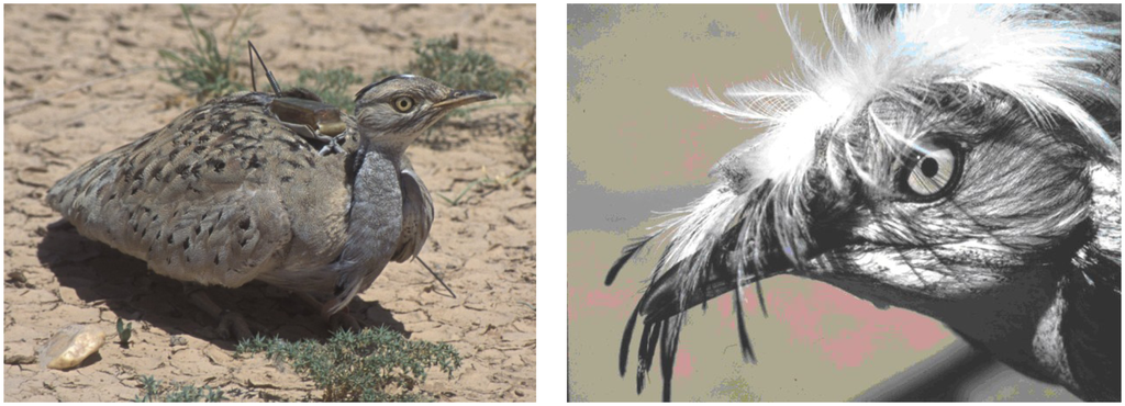 Houbara Bustards (Chlamydotis undulata; Jacquin, 1784) are small to mid-sized birds, measuring 55–65 cm from beak to tail and with wingspans of 135–170 cm. Males weigh 1.15–2.4 kg and females 1–1.7 kg. Three subspecies of Houbara bustard have been recognized: Chlamydotis undulata fuertaventurae, resident in the Canary Islands; Chlamydotis undulata undulata, resident or locally dispersive in North Africa; and Chlamydotis undulata macqueenii (Figure 1), the Asiatic subspecies, resident in southern parts of its breeding range from the Arabian Peninsula across to the Indian subcontinent, but migratory in Central Asia [1]. Based on morphological evidence, some reports argue that the subspecies C. u. macqueenii should be considered as a full species, Macqueen’s Bustard (Chlamydotis macqueenii). However, more extensive genetic studies are required before a unanimously acceptable taxonomic classification can be achieved. Houbara Bustards breed in deserts and other arid sandy areas. North African and Arabian populations may be sedentary or partially migratory, moving relatively short distances to find food; populations from Turkmenistan east to China are migratory, and winter in large numbers in India, Pakistan, Iran and parts of the Middle East.