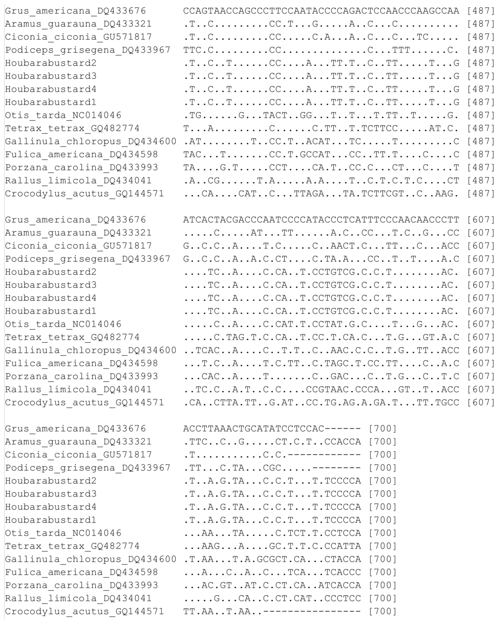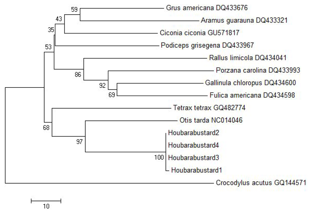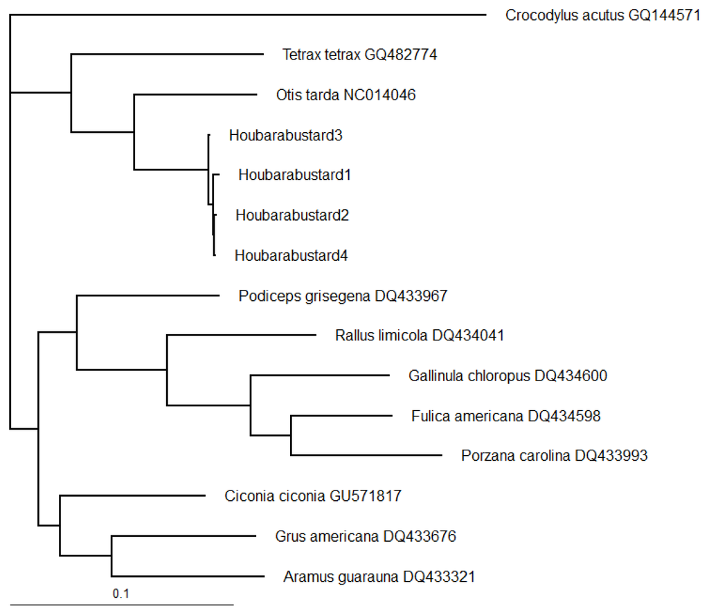 The family Otididae contains 10 genera, including Otis, Ardeotis, Chlamydotis, Neotis, Eupodotis, Lophotis, Lissotis, Houbaropsis, Sypheotides and Tetrax. Unfortunately, the COI barcode data of only two genera (Otis and Tetrax) are available in the GenBank, so we opted to include more families (instead of genera) of the order Gruiformes for a meaningful comparison. The Gruiformes is an order containing a considerable number of living and extinct families, with a widespread geographical diversity. Traditionally, a number of wading and terrestrial bird families that did not seem to belong to any other order were classified together as Gruiformes. These include 14 species of large cranes, about 145 species of smaller crakes and rails, as well as a variety of families comprising one to three species, such as the Heliornithidae, the limpkin, or the trumpeters. However, the COI barcodes of most of these families are yet to be established. The details of COI sequences retrieved from the GenBank for comparative evaluation with COI barcodes of Houbara Bustard are given in Table 3.
