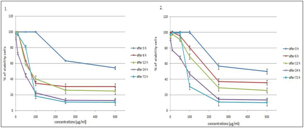 Effects of methanolic leaf extract (1) and fruit extract (2) of L. vulgare on HCT-116 cell proliferation. The cells were treated with various concentrations of extracts and antiproliferative activities were measured by MTT assay after 3, 6, 12, 24 and 72 h of treatment. Results were expressed as means ± SE for three independent determinations.