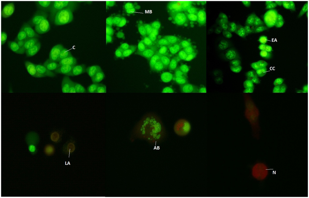 Typical morphological changes of HCT-116 cells induced by 100 μg/mL methanolic extracts of L. vulgare, stained with AO/EB. The images were taken using fluorescence microscopy at 400×. C: control, no treated cells; MB: membrane blebbing; CC: chromatin condensation; EA: early apoptosis; LA: late apoptosis; AB: apoptotic body; N: necrosis.
