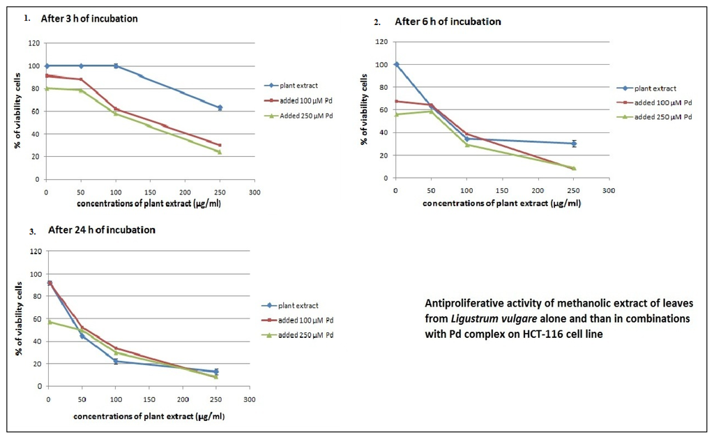 Antiproliferative activity of methanolic leaf extract of L. vulgare alone and in combinations with Pd(apox) complex on HCT-116 cell line. Cells were treated with plant extracts and after 3, 6 and 24 h of incubation Pd(apox) complex was added. The antiproliferative activity was measured by MTT assay after 24 h (1 and 2) and 72 h (3) of initial treatment with plant extracts. Results were expressed as means ± SE for three independent determinations.
