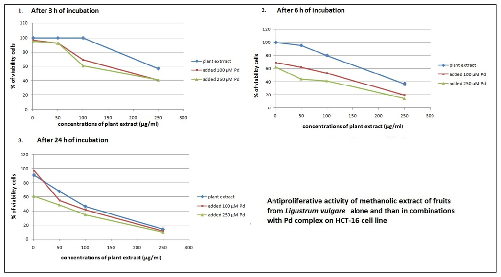 In this study, the antiproliferative and proapoptotic activity of the methanolic extracts of L. vulgare and the chemotherapeutic drug—Pd(apox) complex were investigated in HCT-116 cells by MTT cell viability assay and AO/EB assay. Different combinations of Pd(apox) and plant extracts were used to find those combinations showing the highest potential to reduce viability of HCT-116 cells. Combination assays were performed using appropriate concentrations of methanolic extracts of L. vulgare (1, 50, 100 and 250 μg/mL) with appropriate concentrations of Pd(apox) complex (100 and 250 μM). The Pd(apox) complex was added after 3, 6 and 24 h of cell incubation with plant extract. Cell viability was measured after 24 h (for cells where Pd(apox) was added after 3 and 6 h of cell exposure to plant extracts) and after 72 h (for cells where Pd(apox) was added after 24 h of cell exposure to plant extracts). Cells treated with the same final concentrations of the extracts or chemotherapeutic drugs alone were also examined.