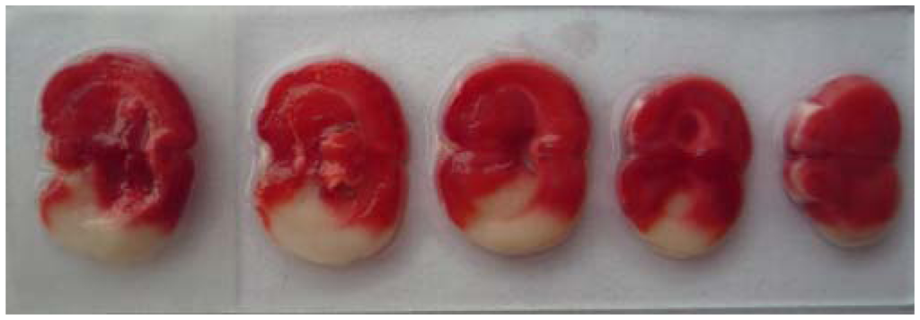 The cerebral infarction volume. The normal brain tissues showed red and infarct tissue white by TTC staining.
