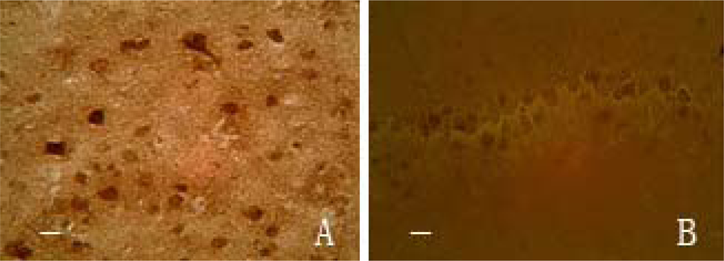 The expressions of NSE in cortex (A) and S-100 in hippocampus (B). The immunochemical positive cells showed brown granules in cytoplasm, bar 25 μm.