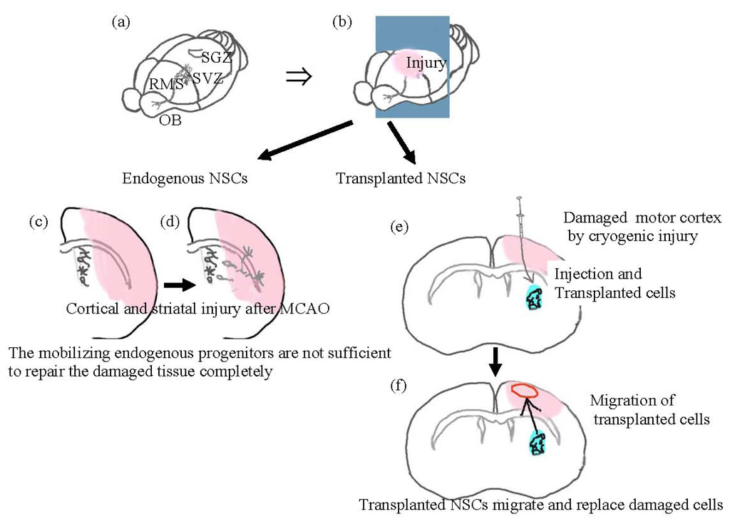 Schematic representation of neural cell migration in mouse brain. (a and b) Stereographic drawing of the brain and three dimensional positions of the subventricular zone (SVZ), subgranular zone (SGZ), rostral migratory stream (RMS) and olfactory bulb (OB). Continuous generation of neural cells is shown in both SVZ of the lateral ventricle and SGZ of the dentate gyrus in the mouse hippocampus; (c and d) Endogenous neural stem cell (NSC) migration to facilitate regeneration of the damaged area in the middle cerebral artery occlusion (MCAO) model. Migratory pathway of the endogenous neural cells generated in SVZ is shown. They migrate to the injured area directly or through RMS and OB. However, numbers of the endogenous cells are insufficient to enable the repair of the damaged tissue; (e and f) Neural cell migration after ES cell derived NSC transplantation in the hemiplegic mouse with brain injury. We injected ES cell derived neural stem/progenitor cells into the periventricular region of the striatum. The transplanted cells migrated to the injured motor cortex and located diffusely over the cortex. We speculated that the grafted cells replaced and regenerated the damaged cortex, leading to recovery of the hemiplegia.