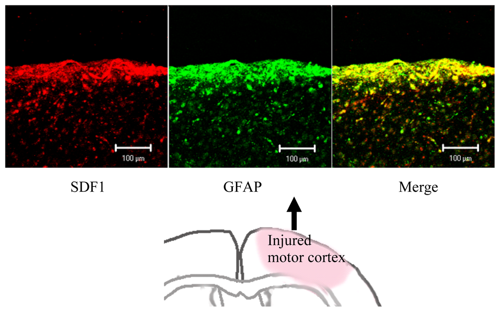 Stromal cell derived factor 1 (SDF1) expression by glial fibrillary acidic protein (GFAP) positive cells in the damaged motor cortex of mice. Motor cortex was injured and stained with anti-SDF1 antibody (Red) and anti-mouse GFAP antibody (Green) in our hemiplegic model. Almost all GFAP positive cells expressed SDF1.