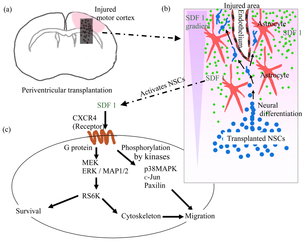 After brain injury, astrocytes respond to some signals from the injured area and produce various molecules which provoke neural stem/progenitor cell proliferation, migration and differentiation to start regeneration of the damaged tissue (Figure 3a,b) [–]. Astrocytes produce several inflammatory chemokines, such as SDF1, MCP1, MIP1α, MIP1β, RANTES and fractalkine [,]. Neural stem/progenitor cells express chemokine receptors, such as CCR2, CCR5, CXCR3, and CXCR4 []. It has been reported that CCR2 (the receptor of MCP1) and CXCR4 (the receptor of SDF1) are involved in the migration of endogenous neural stem cells to the injured area in mice [,]. Interaction between SDF1 and CXCR4 activates several signaling molecules in neural stem cells including p38MAPK, ribosomal S6 kinase, c-Jun and paxillin. The interactions are followed by various cell activities, such as proliferation, chemotaxis and migration with conformational changes of cytoskeleton for neurite outgrowth. The SDF1/CXCR4 interaction on the neural cell graft activates several signaling pathways including mitogen-activated protein kinase (MAPK). Various cellular responses including proliferation and migration of the neural cell graft are induced by the MAPK activation. As for migration, activated p38MAPK is involved in actin reorganization essential for cell migration. The ribosomal S6 kinase (RS6K), which is activated by extracellular signal-regulated kinases (ERK), provokes the phosphorylation of cytoskeletal molecules which are mandatory for cell migration and neurite elongation. MAP/MEK kinase 1 (MEKK1) is essential for cell migration, because the c-Jun N-terminal kinase (JNK), which is phosphorylated by MEKK1, phosphorylates the focal adhesion adaptor molecule, paxillin, important for cell migration. Collectively, accumulation of the phosphorylation and subsequent activation events following SDF1/CXCR4 interaction brings about neural cell migration, observed in mice with neural cell grafts (Figure 3c) [–]. SDF1 stimulates cortical astrocyte proliferation through Src-ERK1/2 activation [].